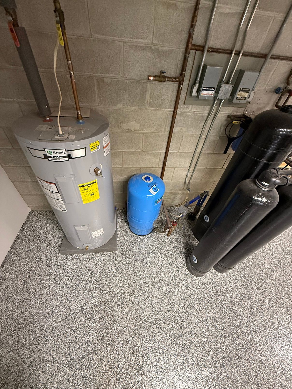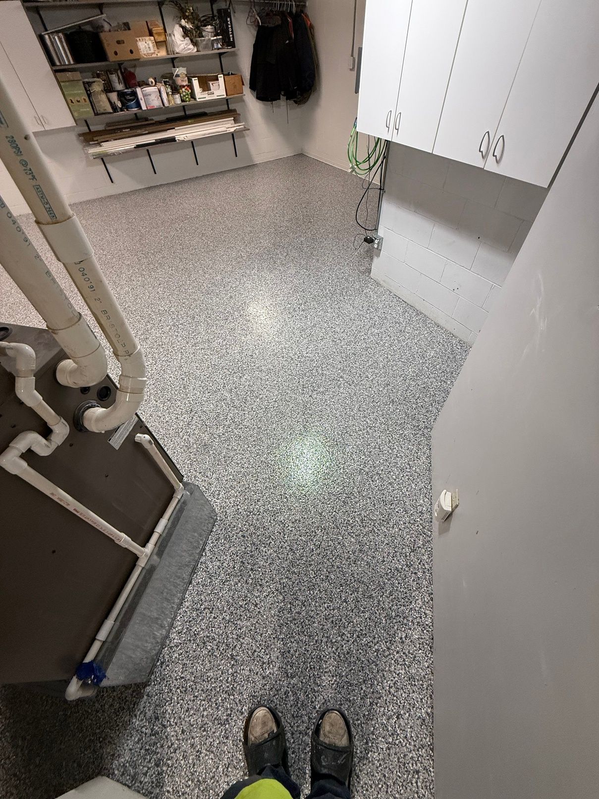 We apply moisture-resistant, stronger-than-epoxy base coats formulated for basement environments, with optional decorative flakes for texture and appearance. The coating thickness is optimized for moisture control and long-term durability while maintaining cost-effectiveness for large basement areas.